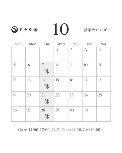 定休日として10月7日(火)、14日(火)、21日(火)、28日(火)を休業日とさせて頂きます。お越しの際はご確認いただきご来店くださいますようお願いいたします。